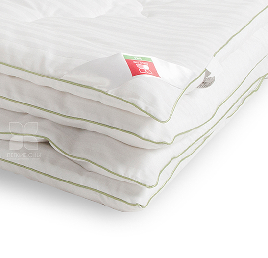 Одеяло выполнено из ткани 100 % хлопка сатин с тиснением страйп в белом цвете, отделка по краю кантом травяного цвета, фирменная упаковка конверт ПВД, спанбонд.