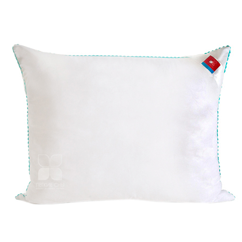 Важно заметить, что синтетический пух столь же лёгок и приятен на ощупь, как и его натуральный прототип. Чехол подушки выполнен из микрофибры (100 % полиэстр) белого цвета с тиснением страйп или волны, отделка по краю подушки кантом зиг-заг бирюзового цвета, фирменная упаковка конверт ПВД, спанбонд.